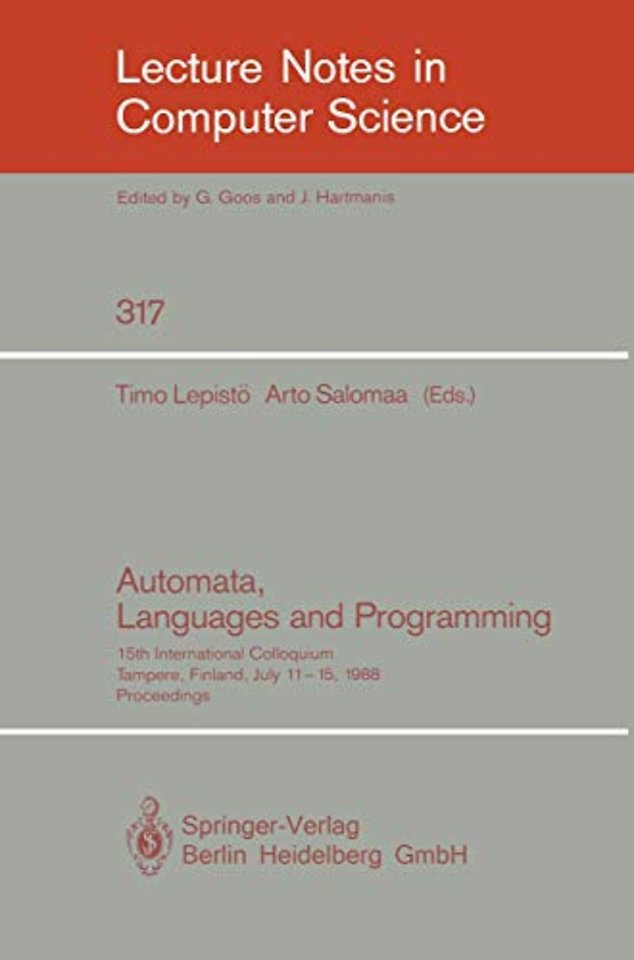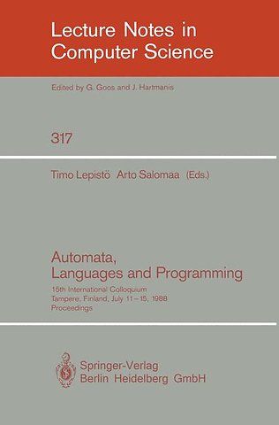 This volume contains the proceedings of ICALP 88, held at Tampere University of Technology, Finland, July 11-15, 1988. ICALP 88 is the 15th International Colloquium on Automata, Languages and Programming in a series of meetings sponsored by the European Association for Theoretical Computer Science (EATCS). It is a broadly based conference covering all aspects of theoretical computer science including topics such as computability, automata, formal languages, analysis of algorithms, computational complexity, data types and data structures, theory of data bases and knowledge bases, semantics of programming languages, program specification, transformation and verification, foundations of logic programming, theory of logical design and layout, parallel and distributed computation, theory of concurrency, symbolic and algebraic computation, term rewriting systems, cryptography, and theory of robotics.