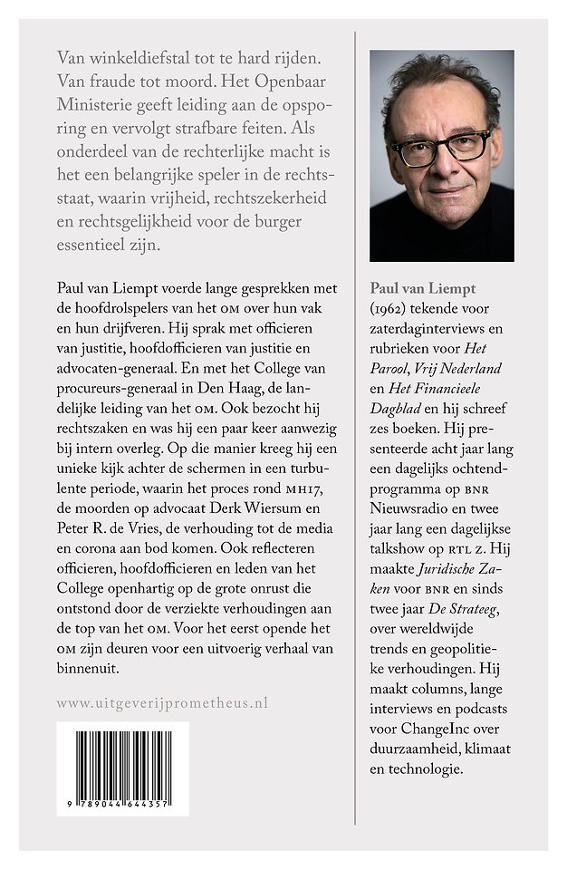 Paul van Liempt voerde vijftig lange gesprekken met de hoofdrolspelers van het OM over hun vak en hun drijfveren. Met officieren van justitie, hoofdofficieren en advocaten-generaal. Hij sprak ook uitvoerig met het College van procureurs-generaal in Den Haag, de landelijke leiding van het OM. Op die manier kreeg hij een unieke kijk achter de schermen in een turbulente periode, waarin ook het proces rond MH17, de moord op advocaat Derk Wiersum, de verhouding tot de media, en corona aan bod komen. En ook het thema integriteit binnenshuis, in de nasleep van het rapport van de commissie-Fokkens over de gevolgen van een liefdesrelatie tussen twee topfiguren van het OM, die tot onrust leidde. Voor het eerst opende het OM zijn deuren voor een uitvoerig en openhartig verhaal van binnenuit.