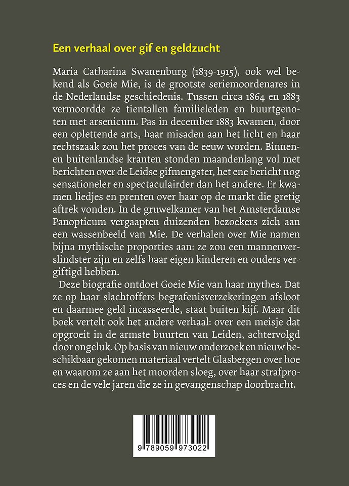 Maria Catharina Swanenburg (1839-1915), ook wel bekend als Goeie Mie, is de grootste seriemoordenares in de Nederlandse geschiedenis. Tussen circa 1864 en 1883 vermoordde ze tientallen familieleden en buurtgenoten met arsenicum. Pas in december 1883 kwamen, door een oplettende arts, haar misaden aan het licht en haar rechtszaak zou het proces van de eeuw worden. Binnen- en buitenlandse kranten stonden maandenlang vol met berichten over de Leidse gifmengster, het ene bericht nog sensationeler en spectaculairder dan het andere. Er kwamen liedjes en prenten over haar op de markt die gretig aftrek vonden. In de gruwelkamer van het Amsterdamse Panopticum vergaapten duizenden bezoekers zich aan een wassenbeeld van Mie. De verhalen over Mie namen bijna mythische proporties aan: ze zou een mannenverslindster zijn en zelfs haar eigen kinderen en ouders vergiftigd hebben.