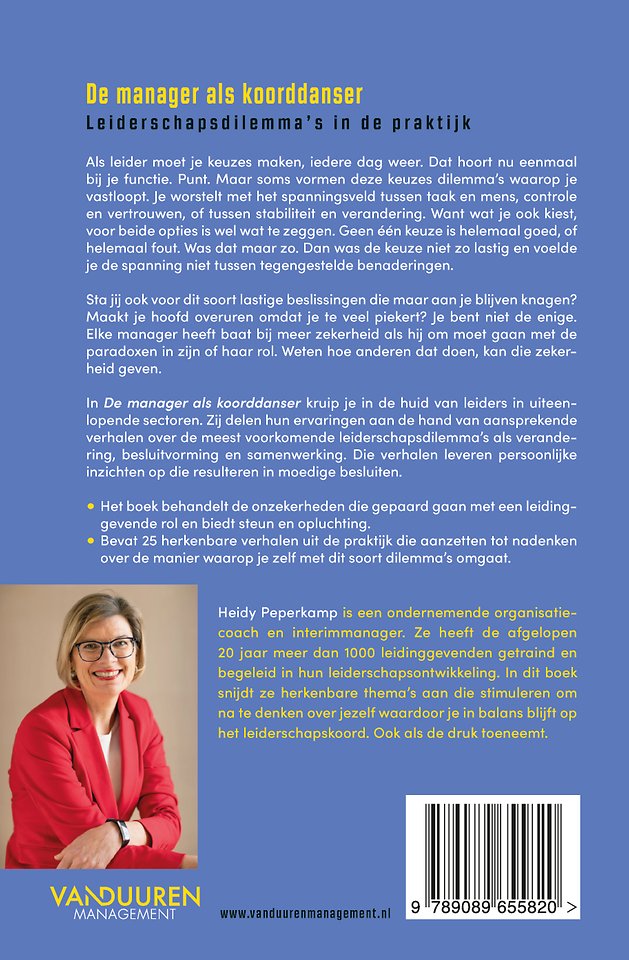 Meer over Heidy PeperkampAls leider moet je keuzes maken, iedere dag weer. Dat hoort nu eenmaal bij je functie. Punt. Maar soms vormen deze keuzes dilemma’s waarop je vastloopt. Je worstelt met het spanningsveld tussen taak en mens, controle en vertrouwen, tussen stabiliteit en verandering. Want wat je ook kiest, voor iedere optie is wel wat te zeggen. Geen één keuze is helemaal goed, of helemaal fout. Was dat maar zo. Dan was de keuze niet zo lastig en voelde je de spanning niet tussen tegengestelde benaderingen.