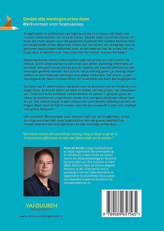 Meer over Peter de RoodeVraagstukken en problemen worden zo complex dat organisaties wel moeten samenwerken om ze op te lossen. Daarbij staat vooral de inhoud centraal, die moet zorgen voor het gewenste resultaat met heldere beslispunten en vastgestelde acties. Maar hoe simpel dat ook klinkt: het draagvlak voor de genomen beslissingen ontbreekt vaak, en de kwaliteit van de acties laat ook nogal eens te wensen over. Hoe komt dat? En vooral: hoe kan het beter?