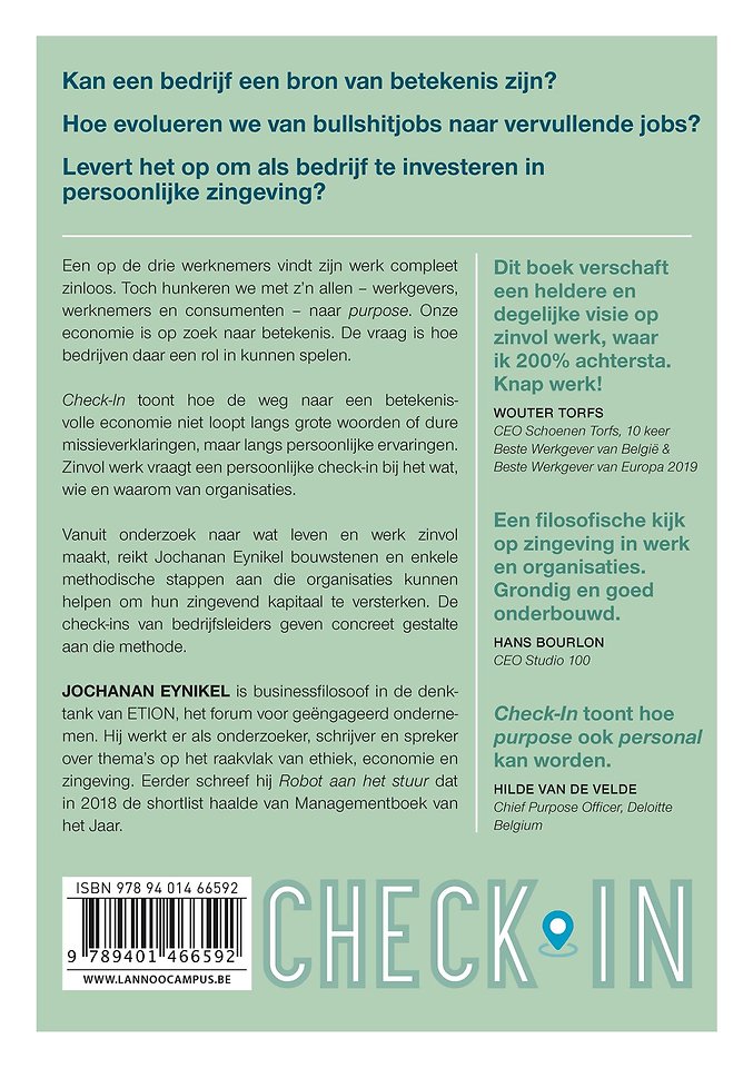 Vanuit onderzoek naar wat leven en werk zinvol maakt, reikt Jochanan Eynikel bouwstenen en enkele methodische stappen aan die organisaties kunnen helpen om hun zingevend kapitaal te versterken. De check-ins van bedrijfsleiders geven concreet gestalte aan die methode.