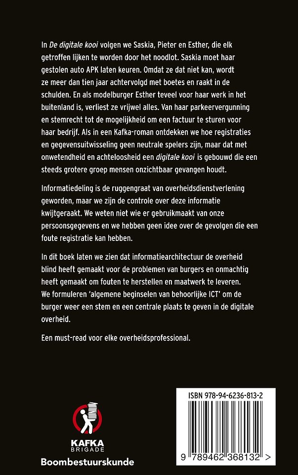 In dit boek laten we zien dat informatiearchitectuur de overheid blind heeft gemaakt voor de problemen van burgers en onmachtig heeft gemaakt om fouten te herstellen en maatwerk te leveren. Zowel burger als overheid zijn gevangen in een digitale kooi. Om hieraan te ontsnappen formuleren we ´algemene beginselen van behoorlijke ICT’ die de burger weer een stem en een centrale plaats geven in de digitale overheid.