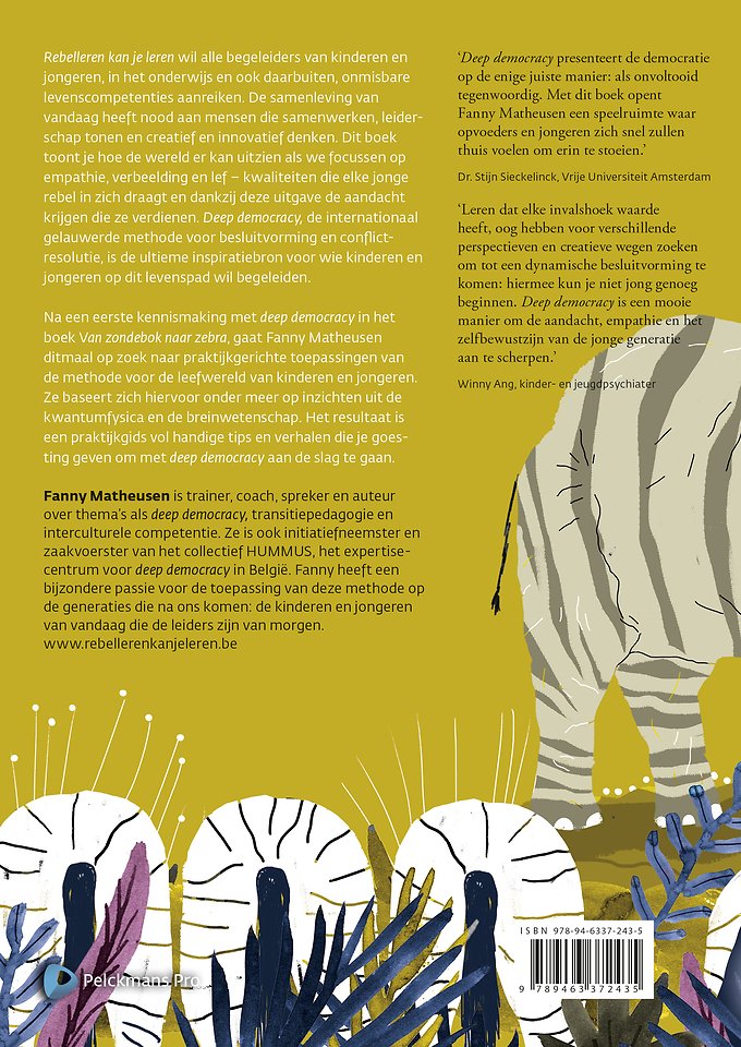 Na een eerste kennismaking met deep democracy in Van zondebok naar zebra, gaat Fanny Matheusen in dit boek op zoek naar praktijkgerichte toepassingen van de methode voor de leefwereld van kinderen en jongeren. Ze baseert zich hiervoor onder meer op inzichten uit de kwantumfysica en breinwetenschap. Het resultaat is een praktijkgids vol handige tips en verhalen die je goesting geven om met deep democracy aan de slag te gaan.